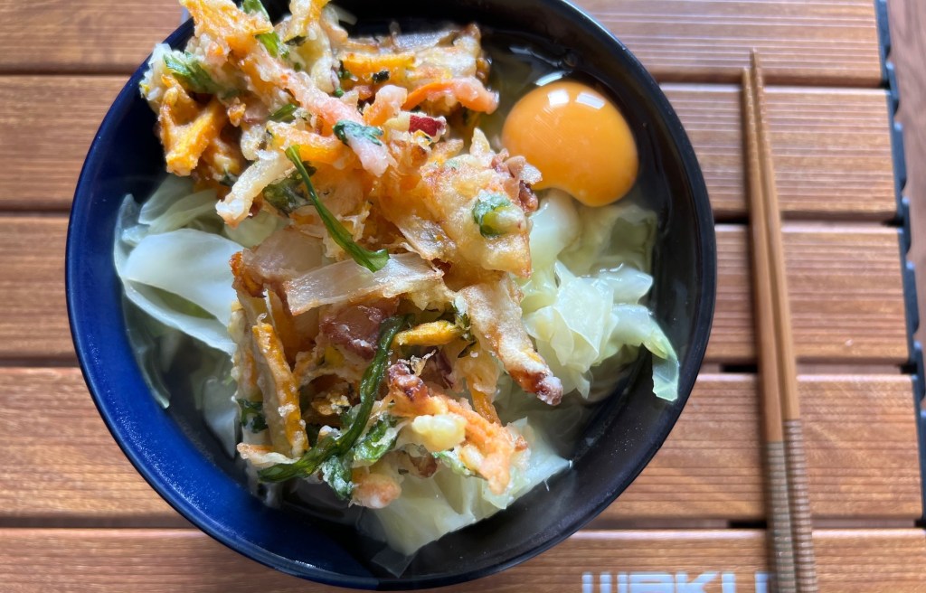 When I started cooking lunch, I decided to skip the carrot and enoki since I already had the kakiage. Instead, I used pork and cabbage. No green onions, but the kakiage had something similar in it, so I let it slide. I boiled soba on one burner and simmered pork and cabbage on the other. For seasoning, I used soba sauce mixed with white dashi, making it into a bonito-based broth. I didn’t measure anything properly, but I always prefer lighter seasoning. I poured the broth over the soba, topped it with the kakiage, cracked a raw egg on top, and it was done. It’s the same soba I always make, but generally, cabbage is not commonly used with soba. Also I might have used a bit too much cabbage this time. It felt more like I was eating cabbage than soba. Still, I love the taste of boiled cabbage, so I tend to go heavy on the vegetables. That said, 158 yen for a single serving of kakiage felt a bit steep. Plus, it’s oily. I might hold back on buying it next time.
