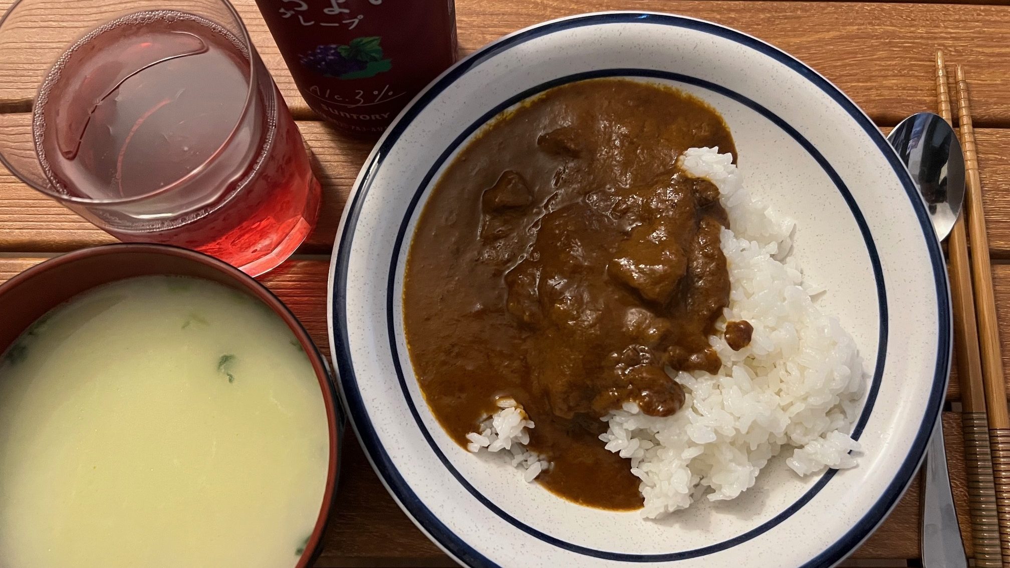 At 6 p.m., I had dinner: a pouch curry and some soup pasta. I added a low-alcohol sparkling wine for a light treat. This curry was something my wife recommended. I found it at a supermarket in Osaka and bought a few for later. All it takes is boiling water to heat it up—no hassle at all. This marks the end of my day. A tiny reward and a quiet preparation for tomorrow. Work resumes again, and I’ve got a hefty batch of blueprints to finish. I’ll turn in early tonight to avoid carrying fatigue into the week.