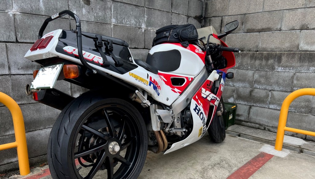 I greeted my faithful companion, the VFR400R (NC30), at our usual bike parking spot. She’s over 30 years old now, but still runs strong.