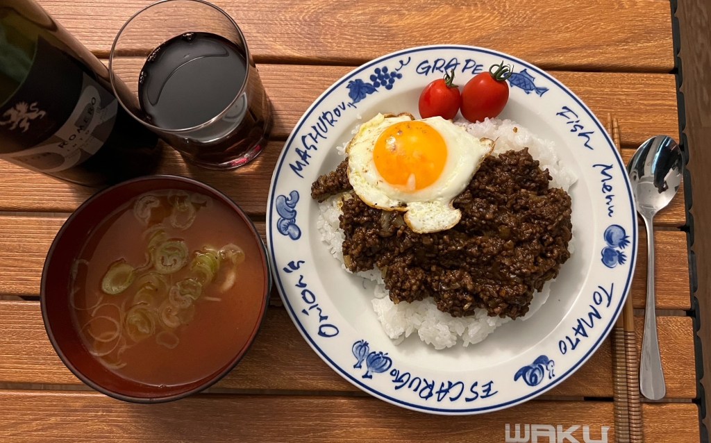 I started by sautéing finely chopped onions in a frying pan, then added minced meat. Once it was well-cooked, I poured in 70 ml of water and brought it to a boil before adding curry roux. On another burner, I fried an egg.