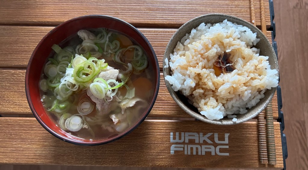 I warmed up the cabbage soup I made yesterday and had it with a bowl of rice topped with raw egg.