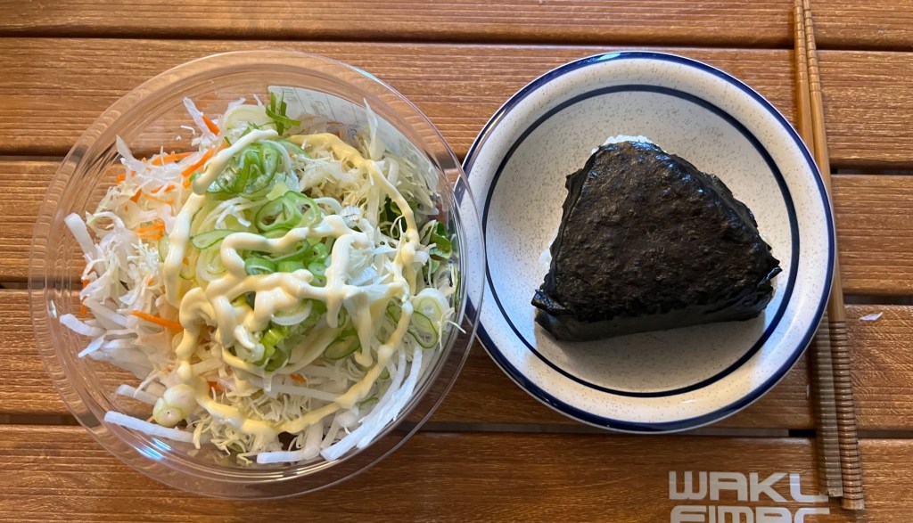 Tonight’s dinner was a rice ball and a salad from the convenience store.