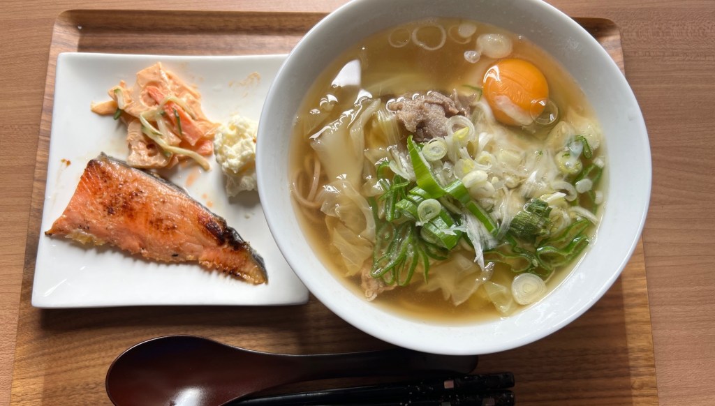 For lunch, I had soba noodles with cabbage and pork, grilled koji-marinated salmon, lotus root with spicy cod roe, and a bit of leftover potato salad.
