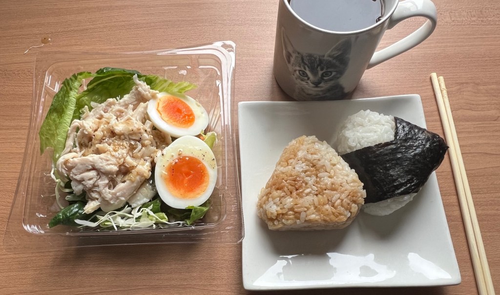The sky is overcast, with occasional light rain. I stayed in bed until 7:30 to get a bit more sleep. I’m working from home today. I’ve grown tired of toast, so I picked up a rice ball and a chicken salad from the convenience store for breakfast.
