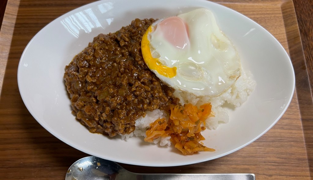 After finishing my morning work and my mother returned from the clinic, I went into the kitchen to start cooking. I finely chopped an onion and sautéed it in olive oil. Once it softened, I added the ground meat, garlic, and ginger, and cooked it thoroughly. Then I added tomato juice and water, brought it to a boil, and mixed in curry roux. The flavor turned out a bit too strong, so I mellowed it with some milk. I topped it with a fried egg toasted in the toaster.