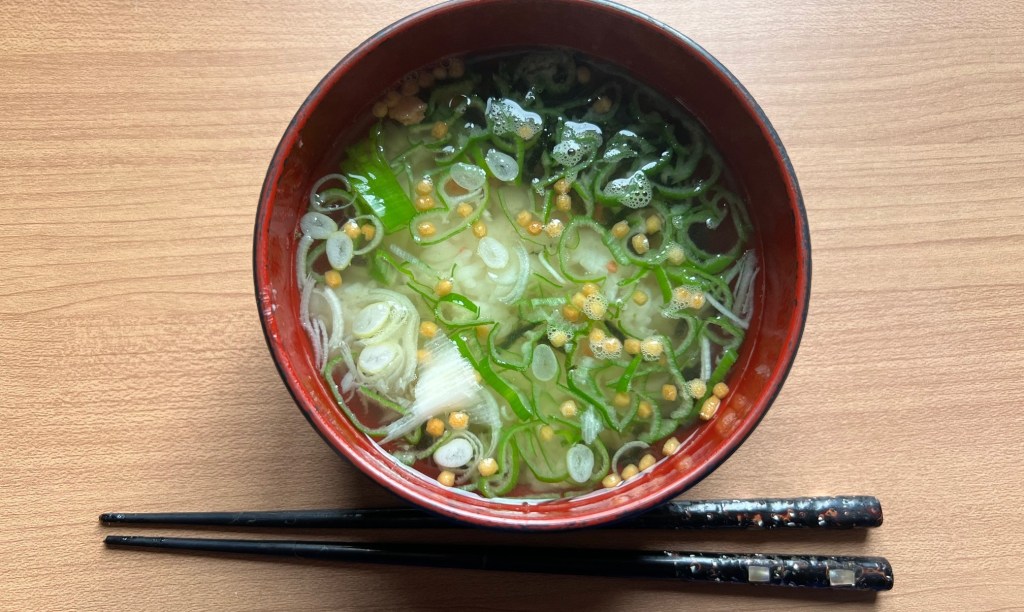 That evening, I had a singles tennis lesson scheduled. Lately, I haven’t been playing very well. I changed the grip tape on my racket to help me focus. About two hours before the lesson, I had a small bowl of rice with ochazuke and added some chopped green onions. Summer lessons are especially draining, and I often get leg cramps, so I try to get a light amount of carbs beforehand without making my stomach feel heavy.