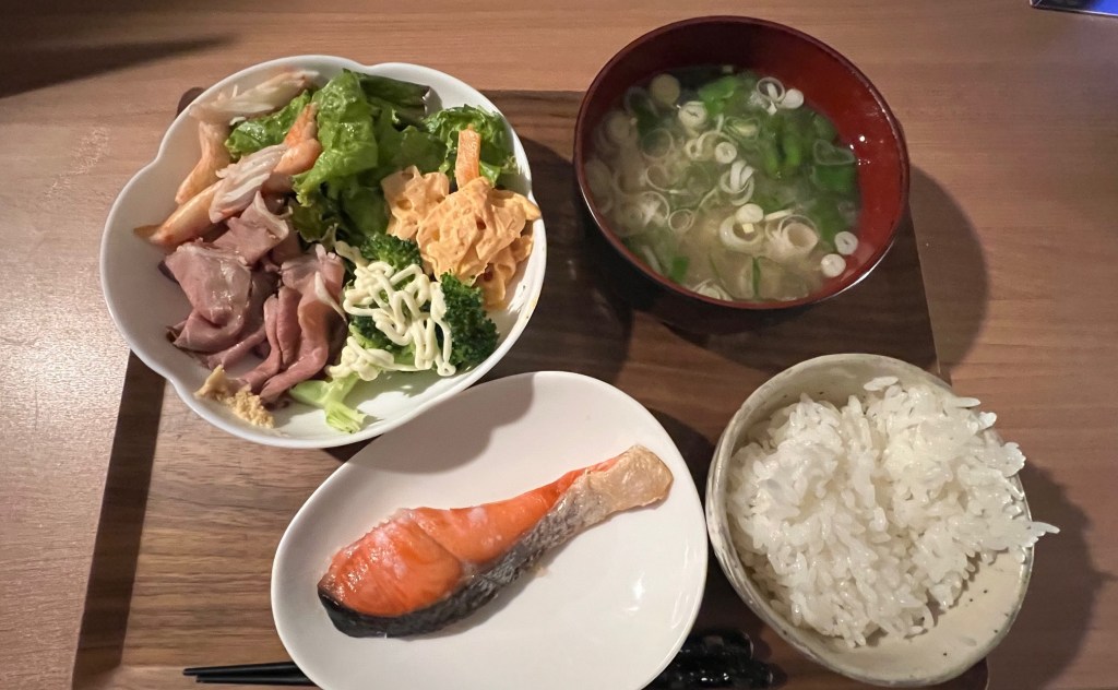 For dinner, I enjoyed a meal my wife had prepared: grilled salmon, roast beef, lotus root salad with mentaiko, and miso soup with clams. Ever since I started cooking myself, I’ve come to deeply appreciate meals made for me. It was all delicious.