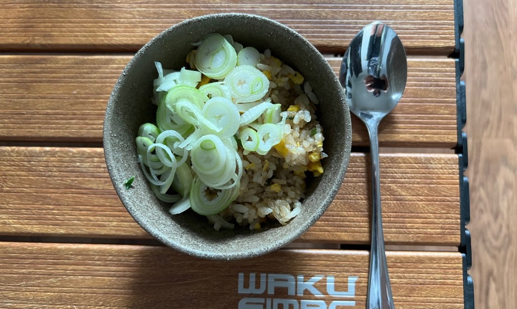 Since I forgot to cook rice yesterday, breakfast ended up being frozen fried rice again. “Pretty heavy-flavored for the morning,” I thought, topping it with some green onions to adjust the taste.