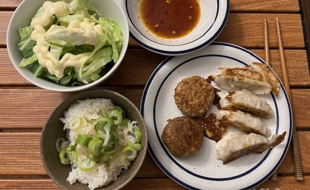 Back home, I took a lukewarm bath to soothe my fatigue. Tonight’s dinner was gyoza and mini hamburg steaks with cabbage. I topped my rice with soba sauce, green onions, and a bit of wasabi. Later, I’ll watch a Gundam anime and try to get to bed early. Maybe this weekend, I’ll finally play some tennis again—it’s been a while.
