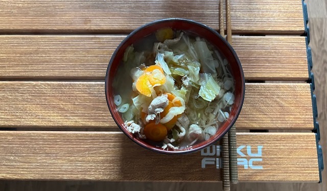 The scaffolding for the exterior repairs of my apartment building still shows no sign of being removed. Yesterday, I came down with a mild case of heatstroke, left work early, and spent the day resting at home. This morning, I made a simple rice porridge using cabbage soup. Feeling somewhat better than yesterday,
