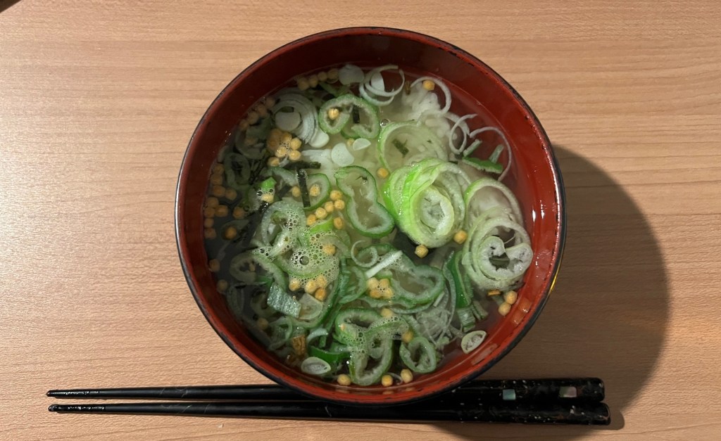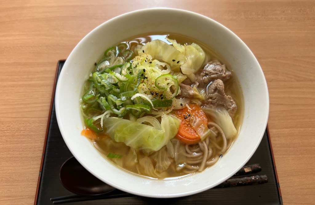 I carefully checked each required document and explained them one by one, guiding her as she filled them out. Everything went smoothly, and since we had some time left, I also helped her fill out the paperwork for the life insurance claim. Even such small interactions felt like meaningful moments of connection between us. For lunch, I made soba noodles with cabbage and vegetable tempura. Well, to be honest, I only used about 70 grams of dried noodles, so it was more like a Japanese-style soup with green onions and cabbage. Still, I really like this dish.