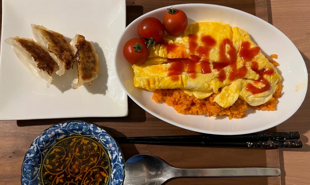 I sent my friend an apologetic LINE message. Before long, my wife came home from work. I was planning to make omelets for dinner, so I started preparing. I fried up some frozen chicken rice in a pan, then on another burner started cooking beaten eggs. Getting the eggs just right is tricky. What I had in mind was placing a soft, fluffy omelet on top of the steaming chicken rice, then slicing it down the middle so it would spread out beautifully and cover everything. Yeah, well, things don’t go that smoothly in real life. Maybe I was feeling rushed from all the work stress, but the eggs ended up a bit too firm and didn’t open up like I wanted. Ah, well. Tough skill to master. Maybe it needs a hot, high flame to keep the outside firm while the inside stays gooey—but it all happens in just a moment, so who knows. I even tried writing something with ketchup, but that didn’t come out very well either. Can you even tell what it says? Yikes. Well, that’s just how it goes sometimes. My mom had made some gyoza, so we all sat down and had dinner together.