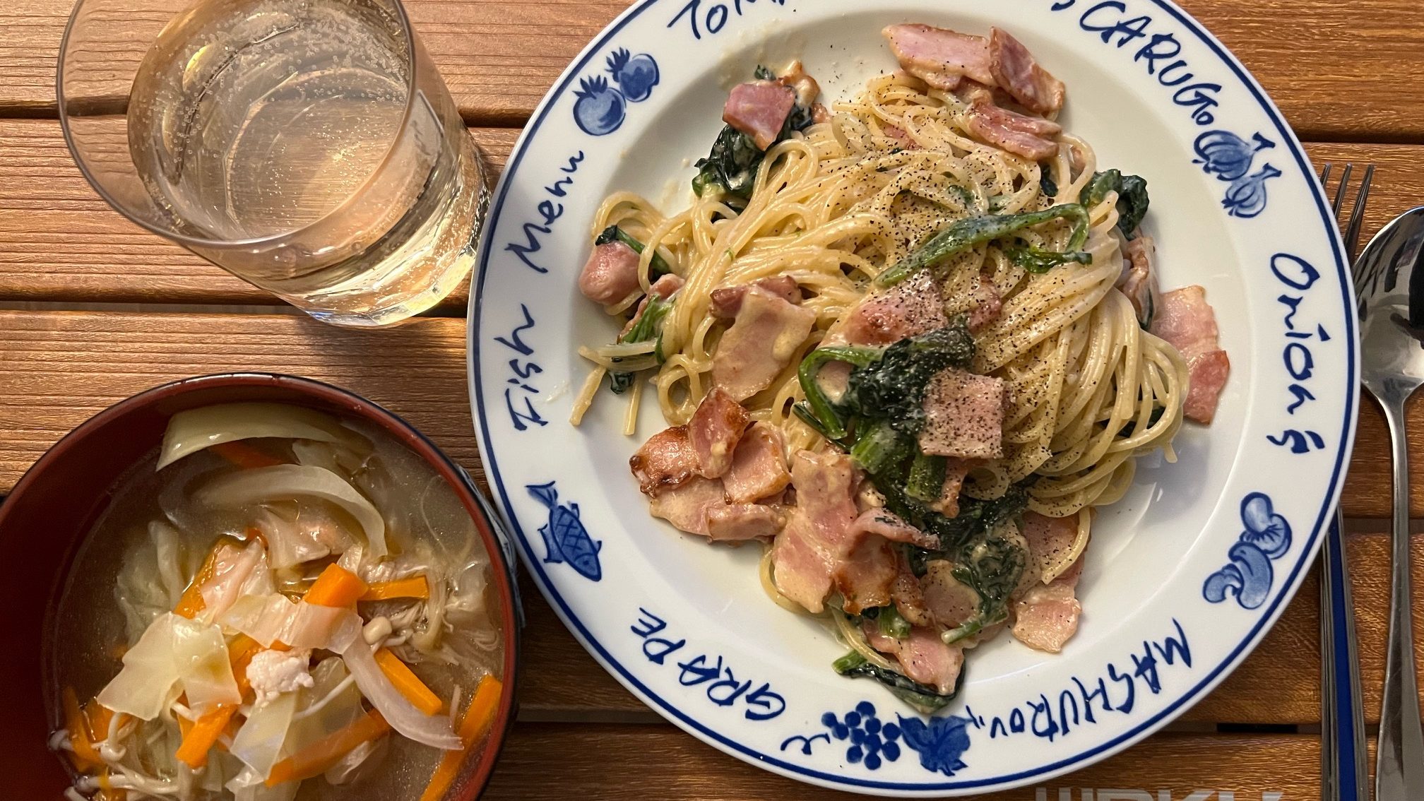 Tonight, I decided to make a Japanese-style soup with spinach, pork, and carrots. I boiled the ingredients and flavored them with soba sauce and bonito broth.