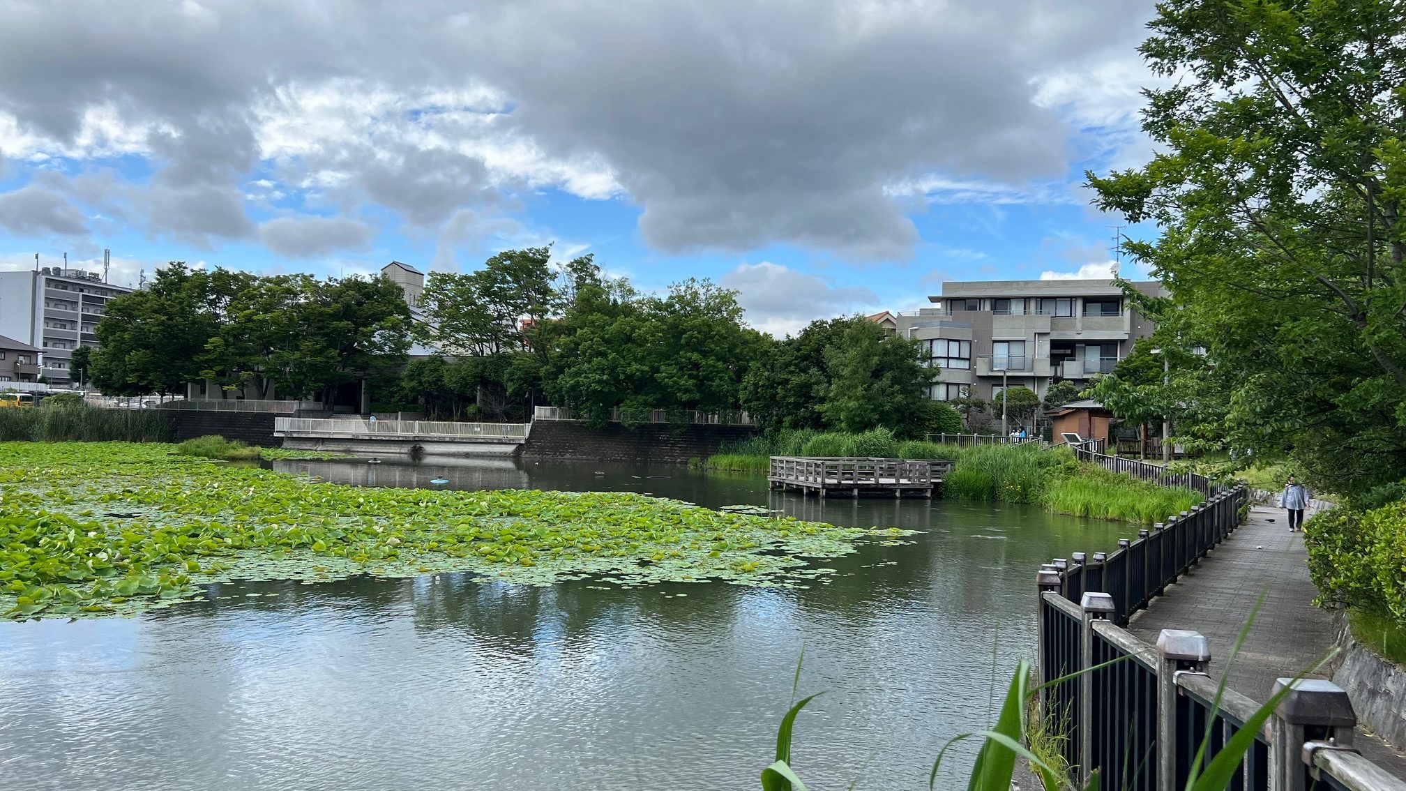 In the photo I posted, the large white building in the center is the Takatsuki City Koteragaike Library, which I introduced before. The Koteragaike pond, where the koi used to swim, lies just beyond it—on the right (south) side of the photo.