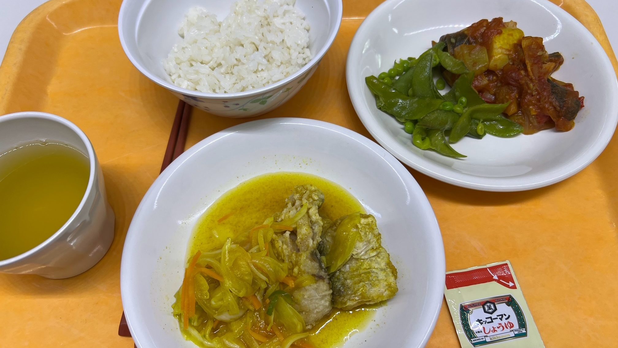 It was white fish in curry marinade, garlic sautéed snap peas, and ratatouille. The cafeteria usually serves rice mixed with barley, but I asked for a smaller portion today to balance out my recent high calorie intake.